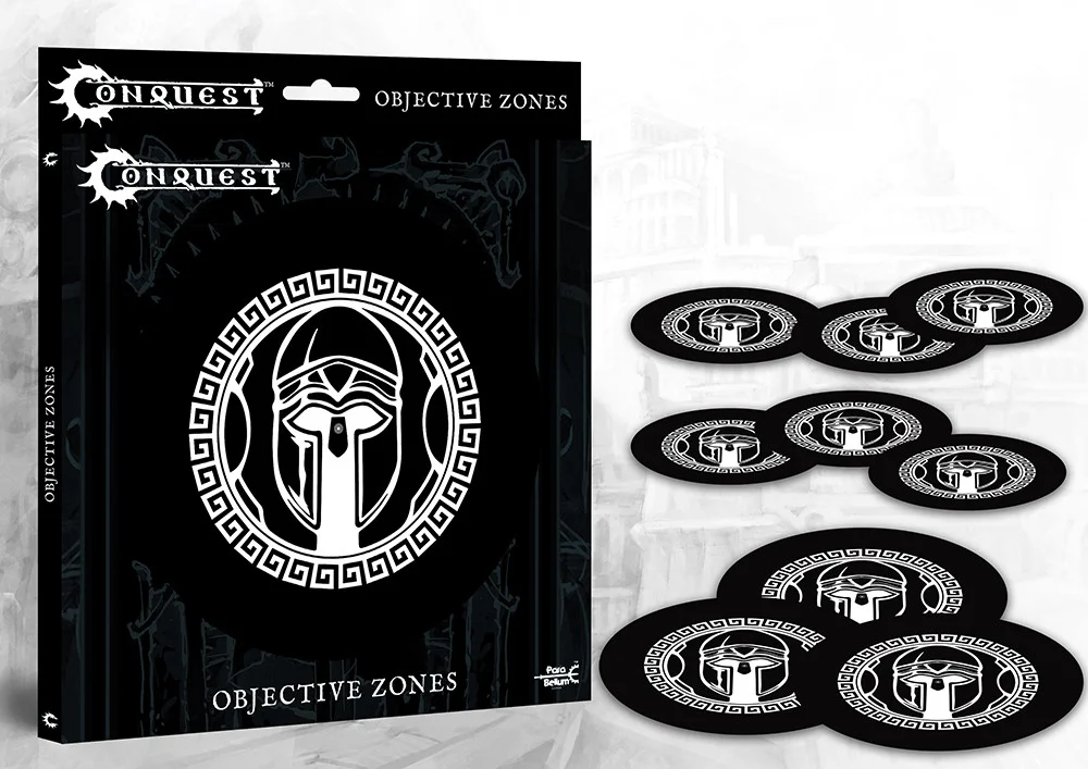 This is a set of 9 Objective Zones in Black with the White City States Faction Logo that brings more Conquest look and feel to your table. A new and unique material that won’t slip on the table, but will allow your models to easily slide over, off and around, these are ultra thin made of .5mm polypropylene.  Great for any wargame play. Three 9″ Zones and Six 6″ Zones packaged together. Made in the EU.