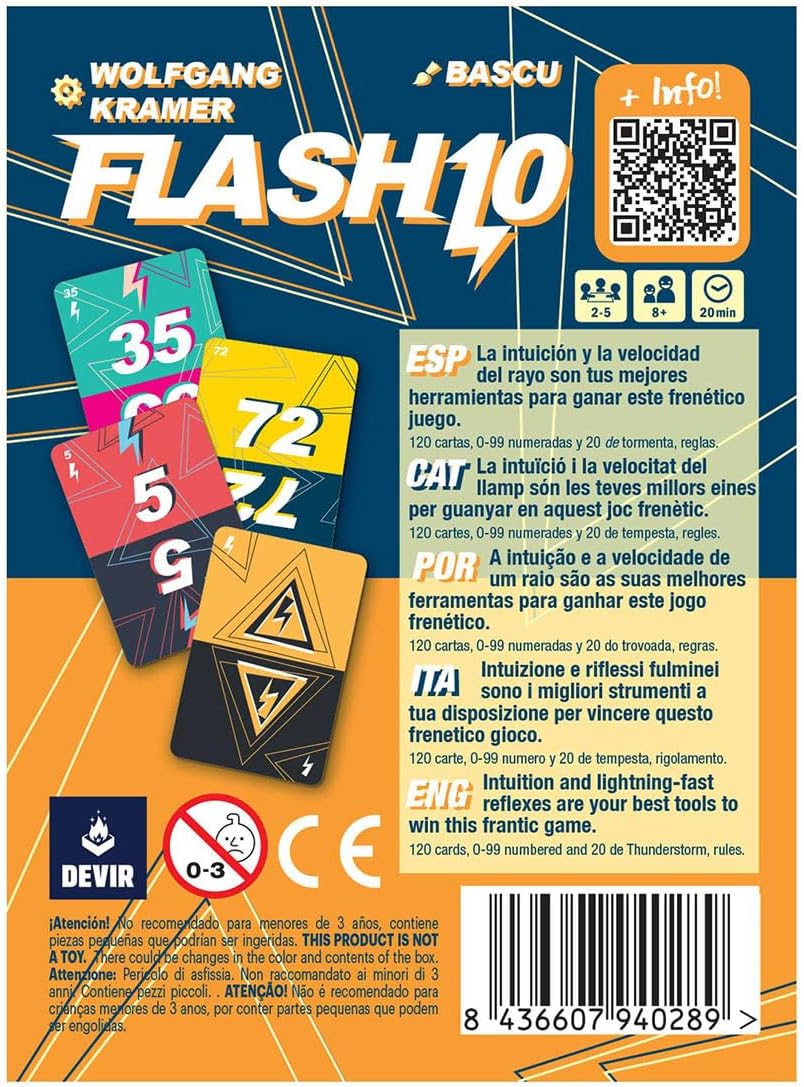 - Diseñado por el legendario Wolfgang Kramer (autor de juegazos como El Grande o Downforce), Flash 10 es un nuevo título de la colección pocket de Devir. Este frenético juego de cartas permite partidas para grupos de 2 a 5 jugadores, a partir de 8 años.