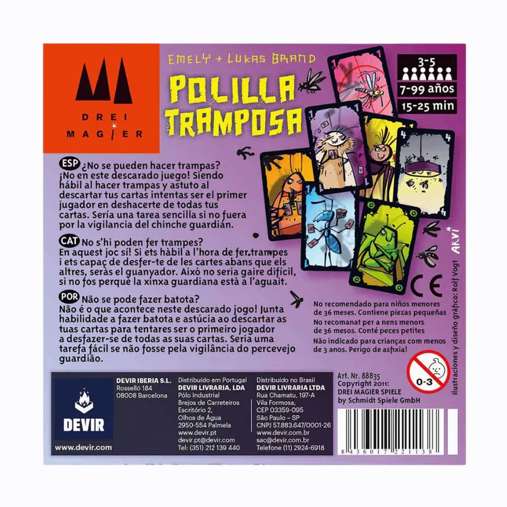 Escóndelas en tu manga, tiralas bajo la mesa, hazlo como puedas pero saca esas cartas de tu mano ¡Todo se vale! La única regla es no bajar las manos de la mesa. Pero ¡cuidado! en La Polilla Tramposa uno de los jugadores es la Chinche Guardián y su tarea será atrapar a los que hagan trampa, el y solo el puede detener a aquellos que decidan hacer trampa.