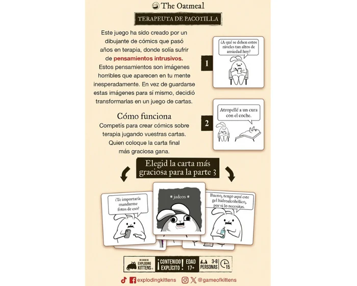 Ideal para reuniones con amigos, fiestas o noches de juegos donde el humor absurdo es el protagonista. Terapeuta de pacotilla fomenta la espontaneidad, la imaginación y el vínculo entre jugadores a través del humor irreverente.