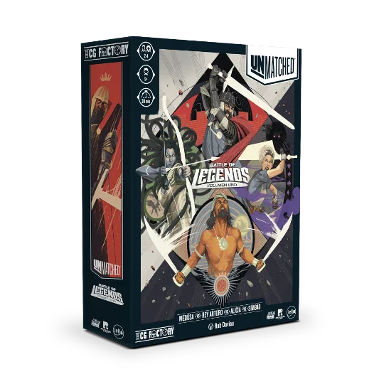 Unmatched es un juego de lucha en miniatura altamente asimétrico basado en cartas, con héroes de mitos y leyendas. Battle of Legends, Vol. 1, incluye al Rey Arturo, Alicia, Simbad y Medusa.